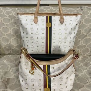 MCM White Canvas Monogram Tote with Brown Leather Trim and Yellow-Black Stripe