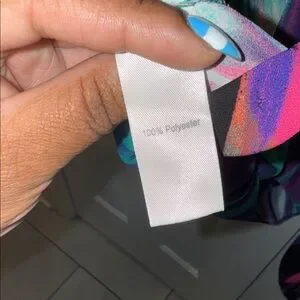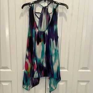 Lightweight sleeveless tank with bold abstract print. Strappy back detail and scoop neckline. Flowy high-low hem for movement. Bright, eye-catching color palette.