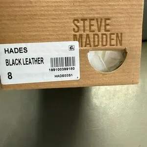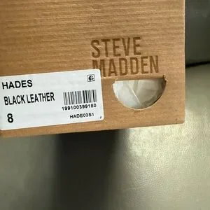 Steve Madden black slide sandals with a comfortable block heel. Smooth leather-look upper and open square toe for modern style. Easy slip-on design for all-day wear. Versatile black color pairs with casual and dressy outfits.