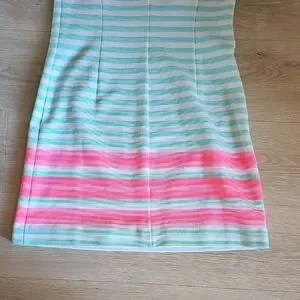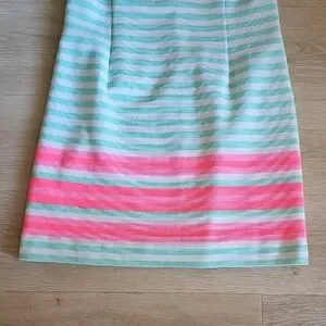 Classic cap-sleeve shift silhouette. Horizontal mint and white stripes with pink striped band at hem. Lightweight, breezy look. Polished and preppy style.
