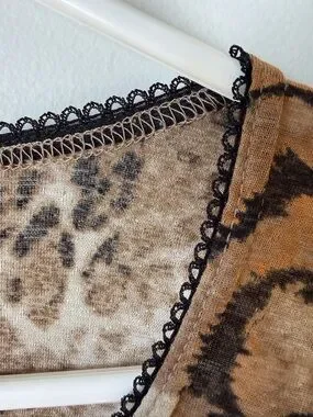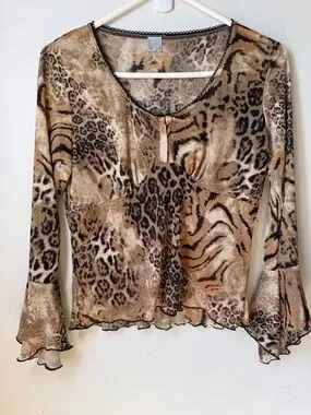 Vintage Y2K sheer stretchy babydoll top mixed animal print. Long flared sleeves. Lettuce hem. Hook and eye closure at neckline. Preowned. Pit to pit 18”. Length 20”