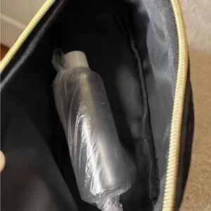 NWT Badgley Mischka Black Patent Cosmetic Pouch with Gold Hardware with bottle