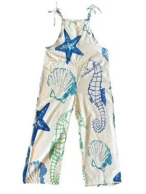 A playful jumpsuit featuring a vibrant seashell and seahorse print in blue and green hues. The piece includes adjustable tie straps for a customizable fit, perfect for a casual summer outing.
