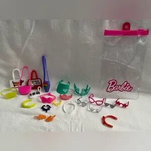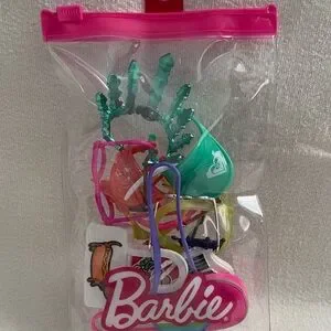 Small Barbie accessory assortment in a clear re-sealable pouch. Includes miniature sunglasses, headbands, stickers, and novelty pieces. Bright colors add playful detail for doll displays and crafts.