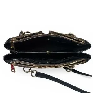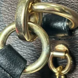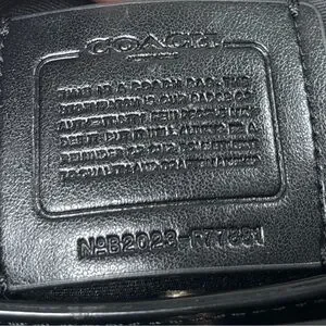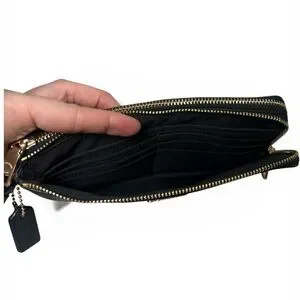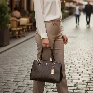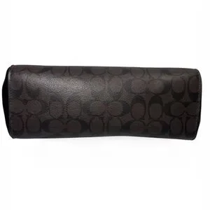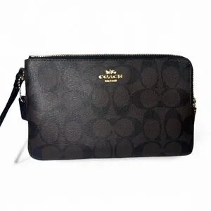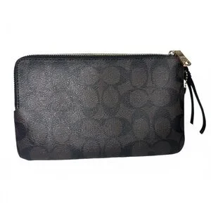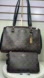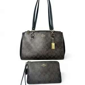 Coach shoulder bag in brown signature monogram. Matching wristlet included. Leather-trim handles and gold-tone hardware. Classic Coach logo and tag detail. Clean, versatile silhouette for day or evening.