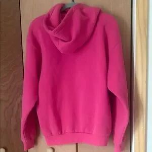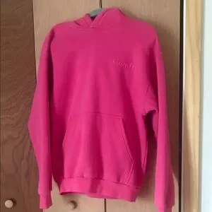 Soft pink hoodie with subtle "Comfrt" embroidered detail. Cozy pullover design with kangaroo pocket and attached hood. Pink color adds a bright, casual look.