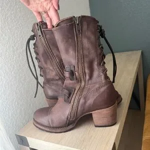 freebird Distressed Brown Leather Buckle Mid-Calf Heeled Boots