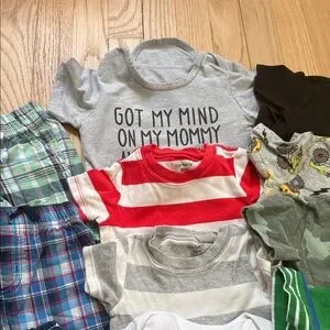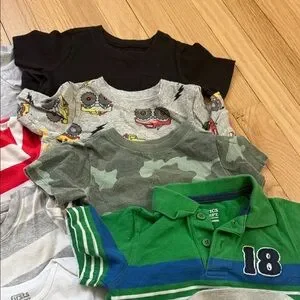 Assorted kids shirts and tops in gray, green, blue, and red. Includes short-sleeve tees, polo shirts, and casual tops with playful prints. Versatile mix for everyday wear and layering. Soft, comfortable fabrics kids will love.