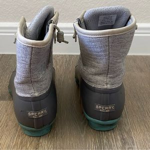 Sperry women's winter/rain boots. Gray fabric upper with rubber lower. Green-accented outsole. Lace-up front with side zipper for easy on. Waterproof lower keeps feet dry. One shoelace is broken, as shown in last picture.