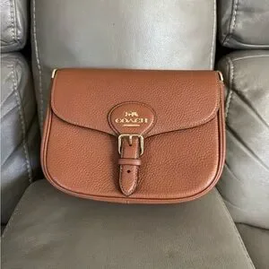 Coach crossbody in pebble leather. Warm chestnut brown color with gold-tone hardware. Saddle-style flap with buckle detail. Compact and stylish for daily wear.