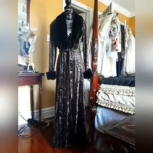 Crushed velvet chocolatw brown robe with faux fur collar and cuffs which have a hidden button closure so they can be removes without being able to tell the difference on or off. Matchong velvet belt amd inner tie. From the designer collection. Hollywood glam. S/M.