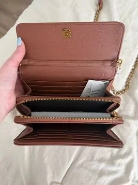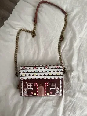 Betsey Johnson festive gingerbread house crossbody. Red body with whimsical candy and tree prints. White scalloped flap with multicolored dot accents. Gold-tone chain strap and hardware. Cute holiday-themed design. Easy to pair with seasonal outfits.