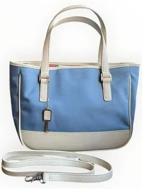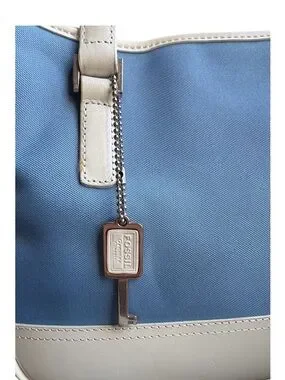 Charming vintage Fossil satchel in good condition featuring the brand’s iconic canvas body, white leather trim, and signature key charm. This style blends classic Fossil craftsmanship with a fresh, coastal color palette—perfect for everyday wear.