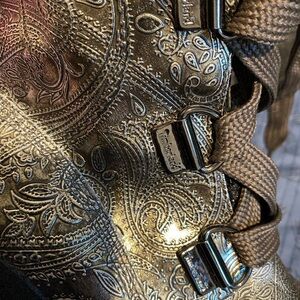 Timberland metallic look embossed leather wedge heel lace up boots. Labeled sample. Not sure if these made it into production but they are show stoppers! Antique stamped silver look with bold embossed detail. Wide velvet top cuff. Thick laces and stamped hardware. Super cool boots size 7