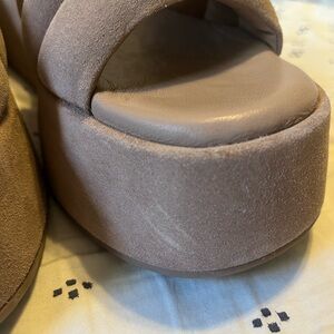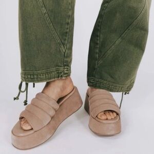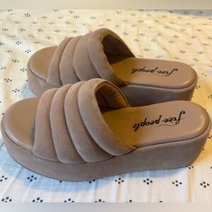 Free People Almost Paradise sandals in a beige/tan color. Suede-like material with a quilted slide design. Platform measures 2.75” at its highest point on the heel. Size 38 / will fit a US Women’s 8-8.5.