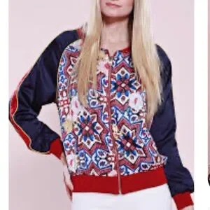 Chic bomber jacket with bold red and blue hues. Features intricate patterns and a stylish zip closure. Perfect for a standout look. Reversible