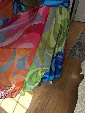 Sleeveless halter style with gathered neckline. Bold abstract color blocks in blue, orange, pink, green and gray. Self-tie waist sash. Flowy maxi silhouette. Lightweight, drapey fabric for movement.