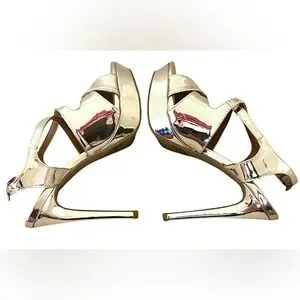 Never worn! Silver metallic faux leather material. Platform of shoes is approximately 1 inch tall, and the heels are 5 inches tall. No visible defects.
