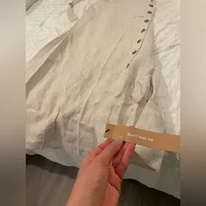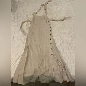 Elegant linen-look halter midi dress by Reformation. Neutral beige color. Side button detailing and high slit. Straight silhouette with a simple neckline. Minimal, chic design for warm-weather events.