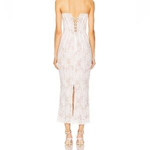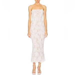 Strapless column dress with floral lace overlay. Fitted silhouette with boning details. Scalloped hem and subtle sheer texture. Chic and feminine design for special occasions.