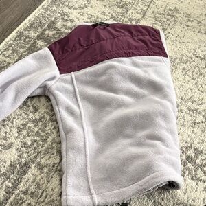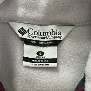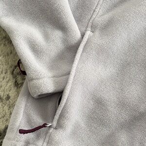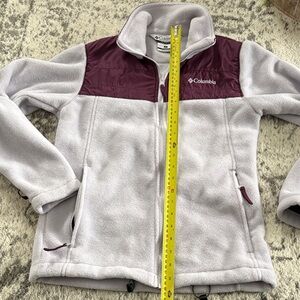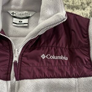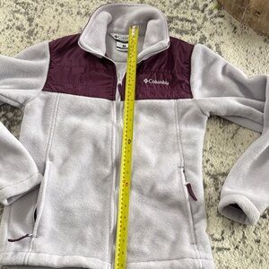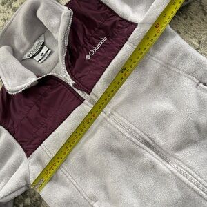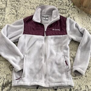 Full-zip fleece jacket by Columbia. Light gray body with burgundy yoke and zipper pulls. Columbia logo on chest. Soft, warm layer for everyday wear.
