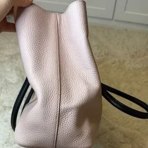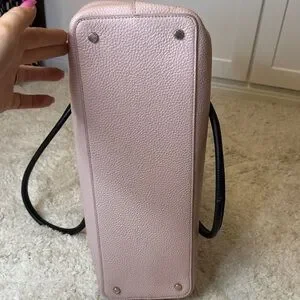 Chic pink tote with stylish black handles. Features a charming bow detail. Perfect for everyday use.