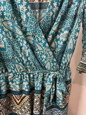 Printed wrap romper with a faux tie elastic waist. Three-quarter bell sleeves for a breezy look. Teal base with gold and cream paisley and geometric motifs. Lightweight, flowy fabric ideal for casual outings. And she has pockets!