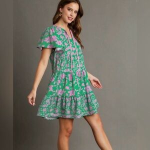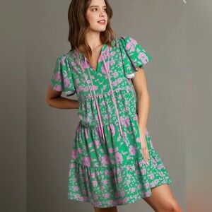 Midi, dress, umgee, floral, spring, summer, cover up, swim, flowy, tiered, pink, green, flutter, tie neck, flattering, polyester, breathable