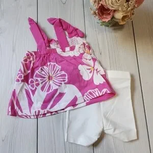 Adorable tropical theme pink tank top adorned with flowers with all white short 2 piece outfit.