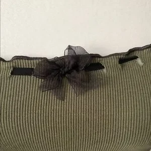 Slim-fit ribbed long sleeve top in olive green. Wide scoop neckline with delicate black ribbon trim and center bow. Slight lettuce-edge hem for a feminine finish. Soft, stretchy fabric for easy layering or solo wear.