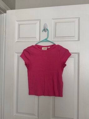 Soft short sleeve tee with a classic crew neck. Fitted, slightly cropped silhouette. Smooth, lightweight knit fabric. Solid bright pink color. Versatile for casual wear or layering.