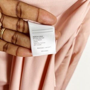 Fully lined, draped neck, ruched left side waist and boned/structured sides, adjustable spaghetti straps, concealed back zip.