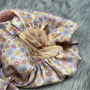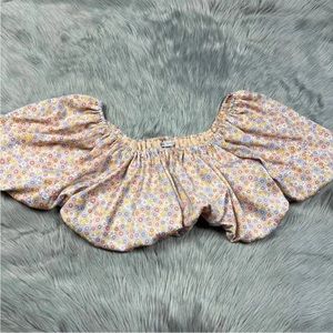 Multicolored floral balloon top that can be worn off shoulder. Elastic in top and bottom hem. Mesh inside lining.