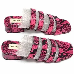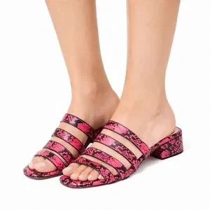 Bold and eye-catching Antonio Melani Merced slide sandals in a vibrant pink snakeskin print. Designed with multiple slim straps across the foot and a low 2” block heel, these are easy to slip on while still looking polished.