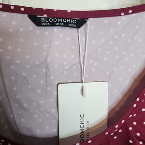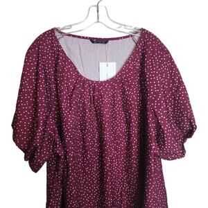 Polka dot top with puff sleeves. Crew neck with pleats. Size 26 which is a 4X based on the BloomChic size chart. Color is close to burgundy.