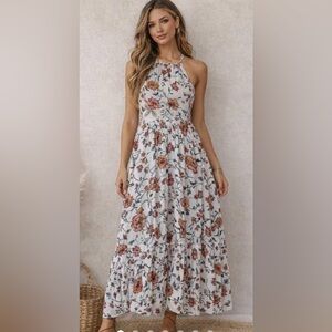 Effortless summer style in a white halter maxi dress featuring rust and brown floral prints. Lightweight, flowy fabric creates a flattering silhouette. Sleeveless design keeps you cool and comfortable. Perfect for daytime events and warm-weather outings.