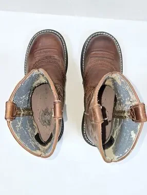 Ariat Fatbaby Original western boots in a classic brown leather finish. Features traditional western embroidery on the shaft, a comfortable round toe, and durable 4LR technology rubber outsoles. These boots offer a rugged, "broken-in" aesthetic perfect for barn work or casual wear.