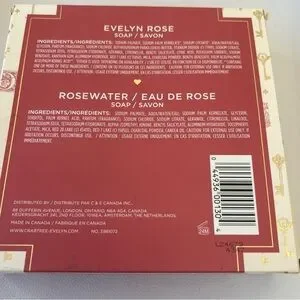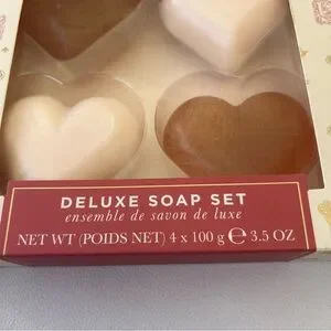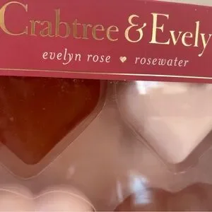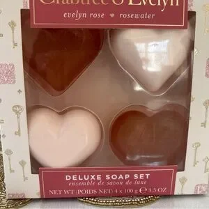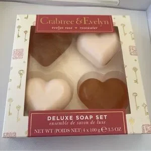 Crabtree & Evelyn Deluxe Soap Set in rosewater scent. Includes heart-shaped soaps in light pink and light brown. Gentle, fragrant cleansing suitable for everyday use. Attractive gift-ready packaging.