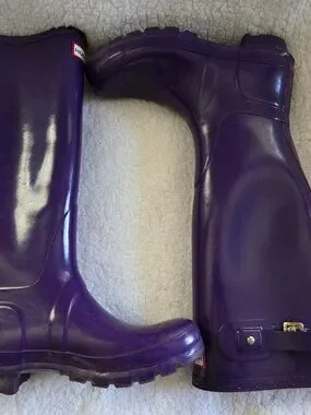 First Introduced In 1956, The Original Tall Gloss Boot Lies at the Heart of The Hunter Brand. Formed Of Natural Rubber, each pair Is Handcrafted From 28 parts and assembled over Three (3) days on an aluminum last bespoke to Hunter. It Is then Vulcanized for superior protection before having the "High Gloss Finish Applied". The Hunter Original tread pattern and comfortable 100% recycled polyester lining completes the design. In purple and stamped on the inside.
