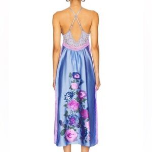 New with tags dress from Free People. Maxi length. Slit. Ruched bust. Lace detailing throughout. Sweetheart neckline. Adjustable criss-cross back.