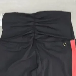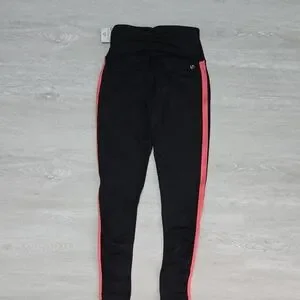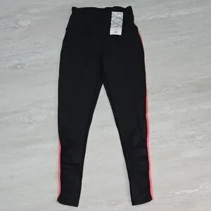 Comfortable high-rise black leggings with a bright coral side stripe for a sporty look. Stretchy fabric delivers flexible support for workouts and everyday wear. Wide waistband offers a smooth, secure fit. Coral side detailing adds a pop of color to your active wardrobe.