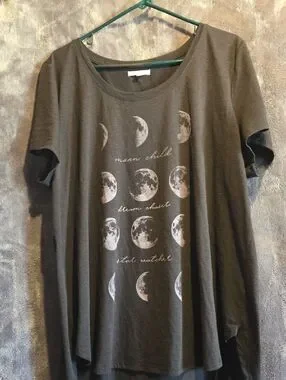 Soft black short sleeve tee by Maurices. Scoop neckline and relaxed fit. Front moon phase graphic with script text. Lightweight, casual style for everyday wear.