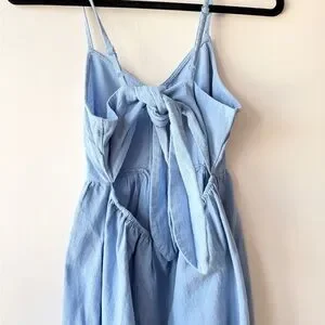 Pale blue midi dress with thin spaghetti straps. Front button-down detail from bust to hem. V-shaped neckline and gathered waist seam. Lightweight, breezy silhouette for casual wear.
