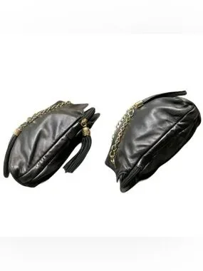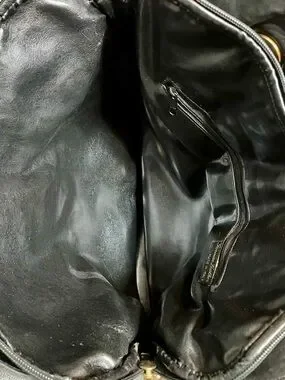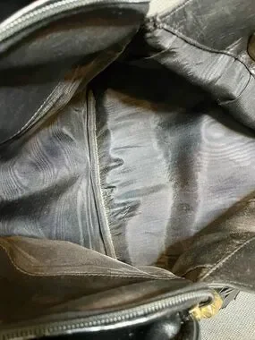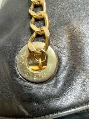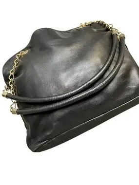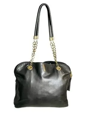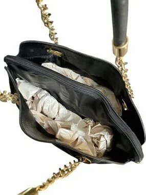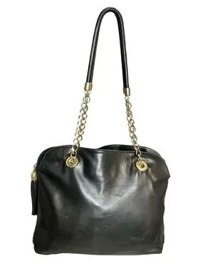 Via Veneto Vintage Black Leather Triple Compartment Tote Dual Gold Chain Handles