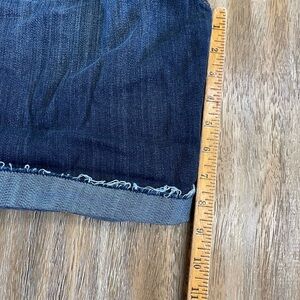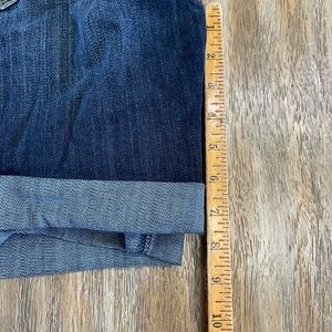 Dark blue denim shorts with a rolled cuff hem. Five-pocket styling and visible whiskering. Stretch denim for comfortable wear. Versatile wardrobe staple. Like New / NWOT Mid Rise