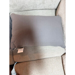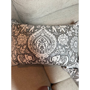 This listing features two decorative accent pillows from EnVogue International, LLC, in a gray and white elephant pattern. The rectangular pillow showcases a detailed design with elephants, floral motifs, and a central medallion. The reverse side is solid gray. The tag indicates the pillow is filled with duck feathers and measures 16" x 24". Two pillows are shown, both appearing to be in new condition without visible signs of wear.