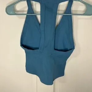 Sleeveless ribbed crop tank with racerback silhouette. Sold out Celestial Blue and fitted cut. Smooth, stretchy fabric for everyday wear.