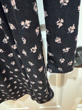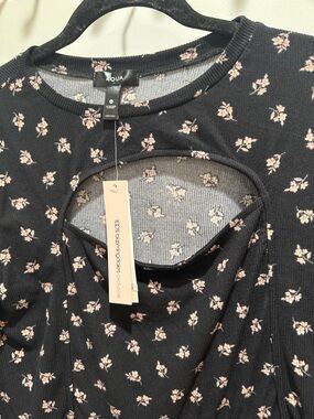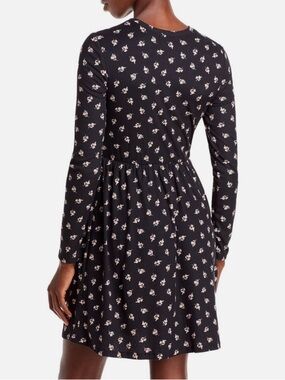 Aqua dress featuring small pale pink floral print. Rounded front cutout detail. Ribbed knit fabric with long sleeves. Feminine silhouette suitable for layering.
