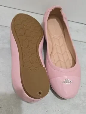 Coach women's ballet flats in light pink with glossy cap toes. Logo plaque on the toe for signature detail. Quilted cushioned insole for comfort. Elasticized heel for a snug fit.