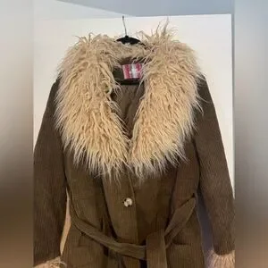 The ultimate 70s-inspired statement piece! This Urban Outfitters "Tasha" trench coat features a beautiful olive green corduroy body with dramatic, shaggy faux fur trim on the collar and cuffs. It has a heavy, high-quality feel and a flattering longline silhouette.